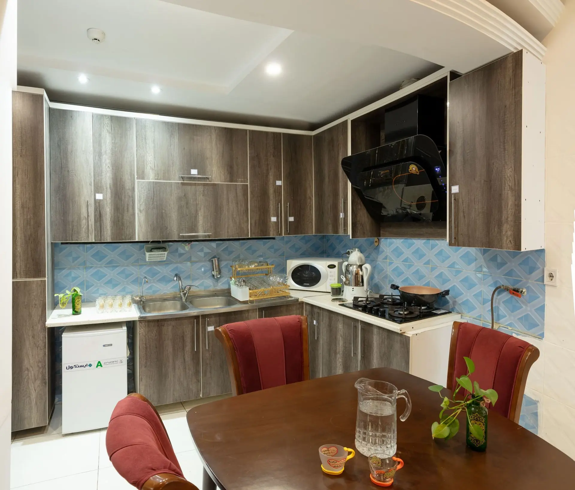 آشپزخانه ای مجهز به یخچال، مایکرویو و ظروف مناسب برای استفاده تمامی اعضاء